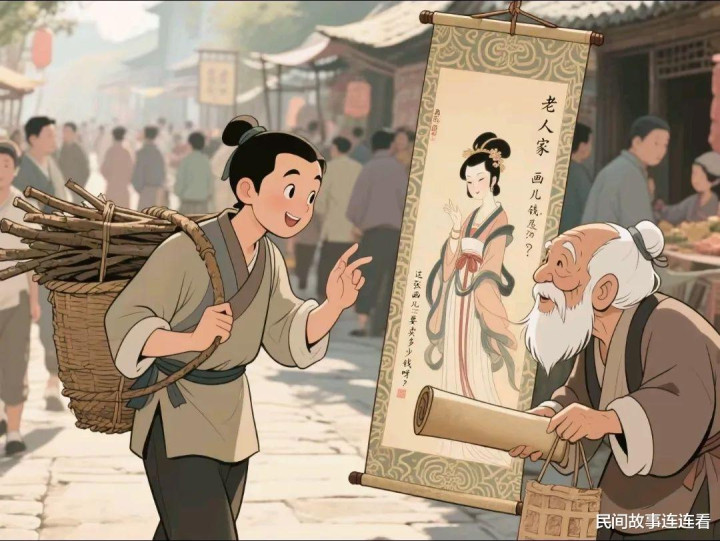 过了些日子,柴郎挑着一担柴进城售卖。在热闹的集市上,他瞧见一位白胡子苍苍的老头正拿着一轴画卷叫卖。柴郎走近一瞧,只见画卷上绘着一位风姿绰约的美人。柴郎越看越着迷,心中欢喜不已,便开口询问老头儿:“老人家,这张画儿要卖多少钱呀?”老头微笑着说:“就用你这担柴换吧!”柴郎一听,二话不说,赶忙把那担柴往老头跟前一推,兴奋地说道:“我买啦!”说完,伸手接过画轴,小心翼翼地卷起来,揣进怀里,而后满心欢喜地踏上了归途。