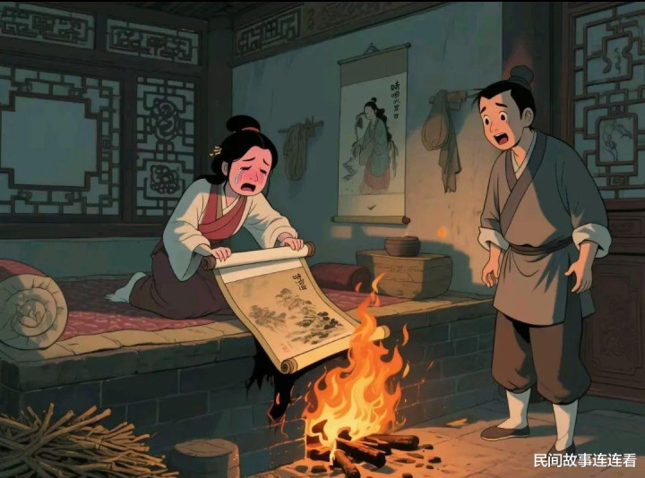 到了晚上,柴郎留了个心眼,躺在炕上假装打呼噜,其实两眼偷偷地观察着屋里的动静。大约到了五更天,只听见墙上挂着的轴画上隐隐有动静。柴郎定睛一看,那画中的姑娘竟然动了动,眨眼间就变成了一个活生生的人,轻盈地从画上走了下来。只见她先是往锅里添了些水,而后走出屋子抱了一捆柴进来,接着坐在灶膛边熟练地生起火来。柴郎又惊又喜,按捺不住内心的冲动,“哧溜”一下从炕上起身,迅速将那空画轴一把塞进了灶膛。火焰瞬间吞噬了画轴,画上下来的姑娘见状,眼眶泛红,委屈地哭了起来。